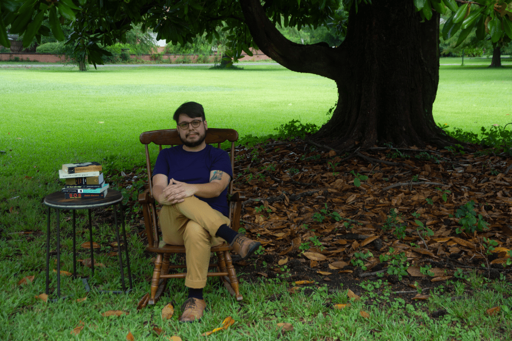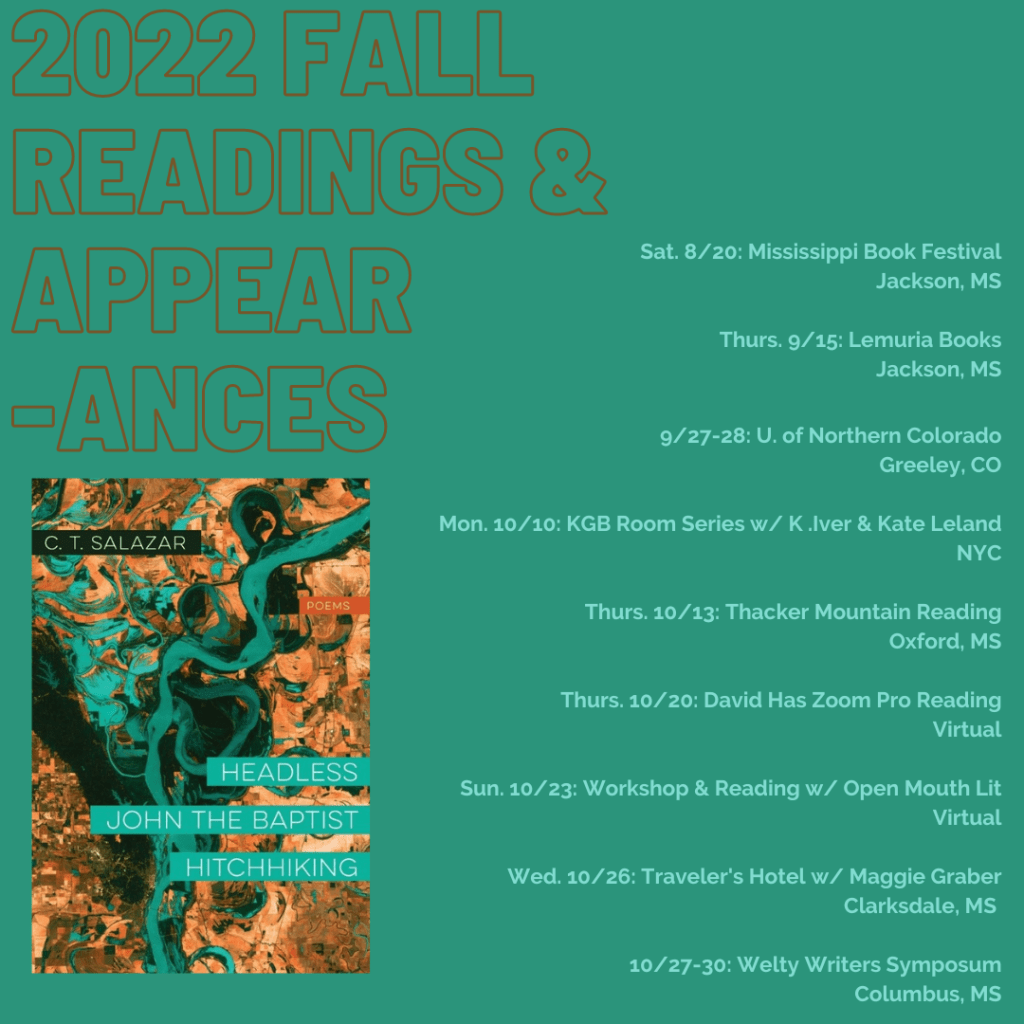 C.T. Salazar is a Latinx poet and librarian from Mississippi. His debut collection, Headless John the Baptist Hitchhiking is now available from Acre Books. He’s the author of three chapbooks, most recently American Cavewall Sonnets (Bull City Press, 2021). He’s the 2020 recipient of the Mississippi Institute of Arts and Letters award in poetry. His poems have appeared in The Rumpus, Beloit Poetry Journal, Cincinnati Review, 32 Poems, RHINO, and elsewhere.